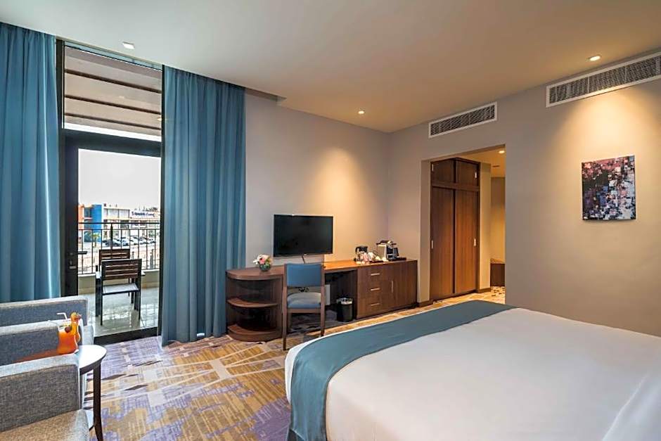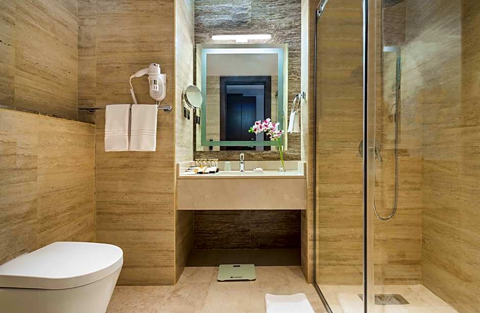 This spacious suite consists of 1 living room, 1 separate bedroom and 1 bathroom with a walk-in shower and free toiletries. The suite features carpeted floors, a seating area with a flat-screen TV with cable channels, air conditioning, soundproof walls, as well as a mini-bar. The unit offers 1 bed.